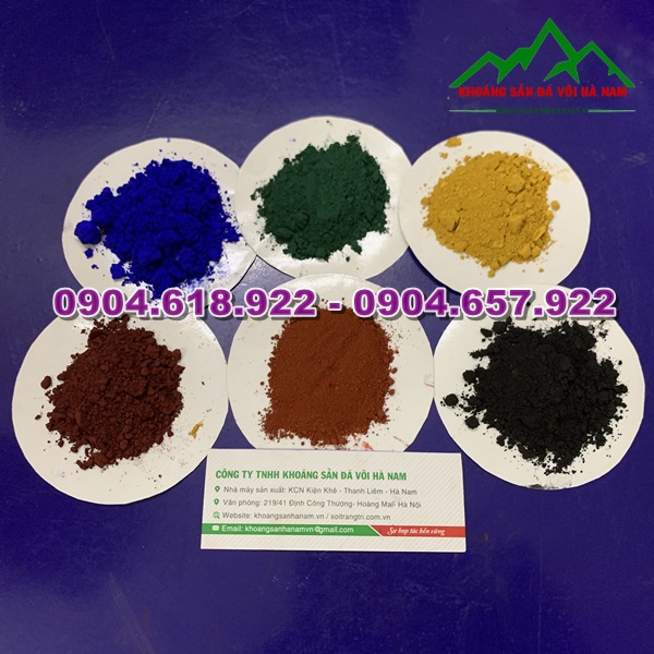 – Màu sắc: Bột màu oxit sắt đỏ nâu (Red H101), Bột màu oxit sắt vàng (Yellow G313), Bột màu oxit sắt đen (Black 722), Bột màu oxit sắt đỏ cam tươi (Red Y101), Bột màu xanh lá (Green LU01-01), Bột màu xanh dương.