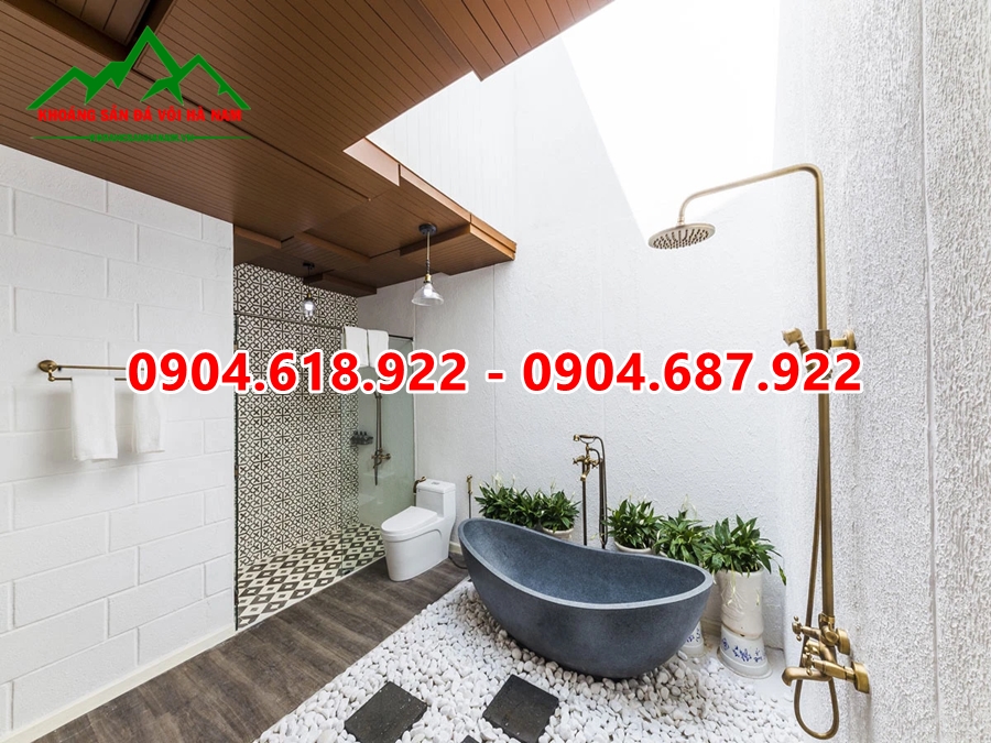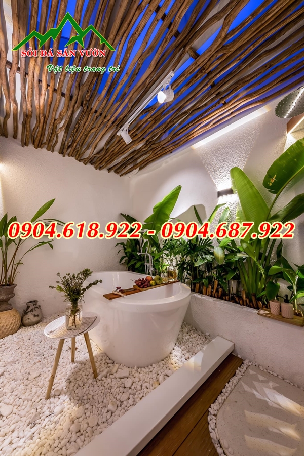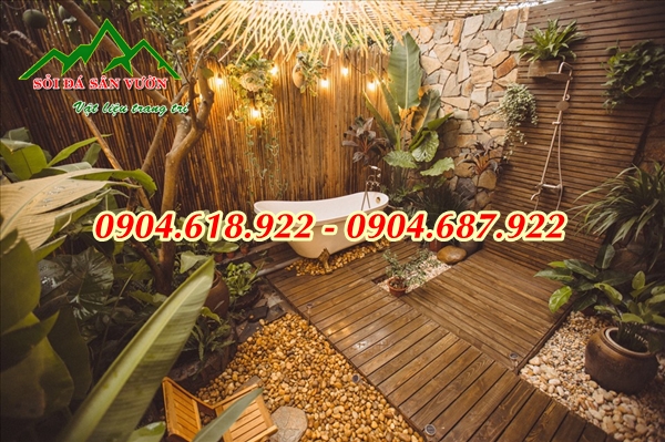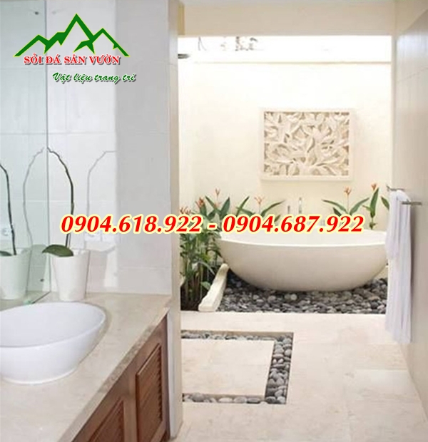 Một cách đơn giản hơn cho bạn chính là sử dụng sỏi, đá lát rải nền xung quanh khu vực nhà tắm như: vòi hoa sen hay bồn tắm. Cách làm này vừa có chi phí rẻ, vừa không phải thay đổi kết cấu nhà tắm lại không lo bị hỏng hóc. Một sự biến đổi nho nhỏ này thôi cũng sẽ giúp bạn có những phút giây thư giãn.như đang ở bên con suối róc rách, mát lành.
